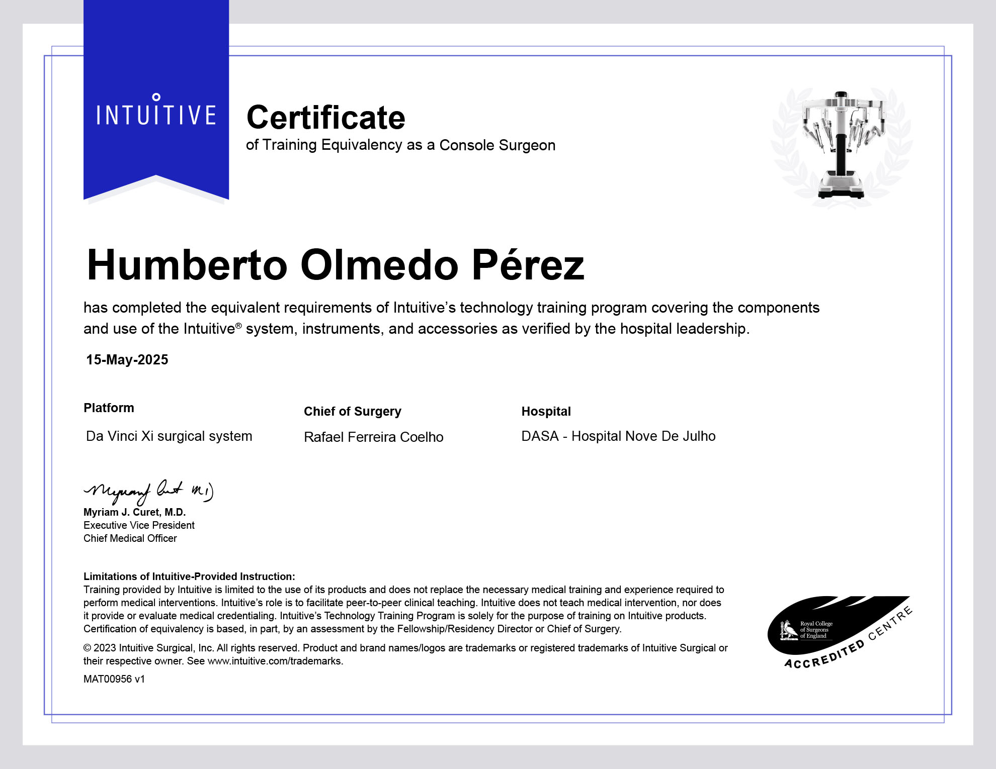 Estoy Certificado en cirugía robótica con el sistema Da Vinci por el Hospital Nove de Julho (São Paulo), uno de los centros más avanzados en América Latina en cirugía mínimamente invasiva.